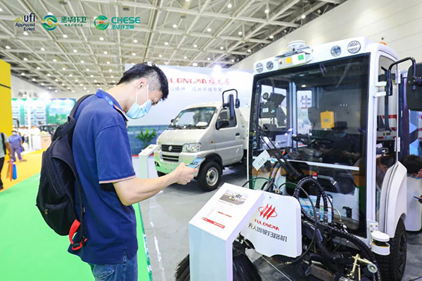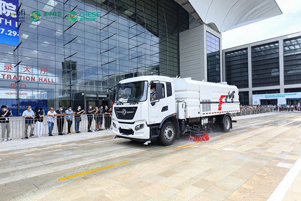 路演环节,“福龙马”牌高速洗扫车吸引现场众多观众驻足观看。