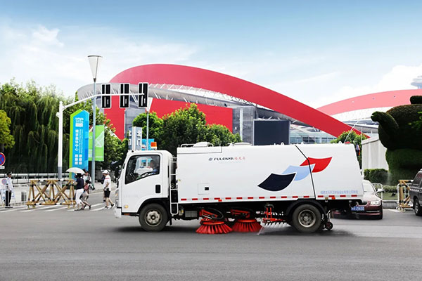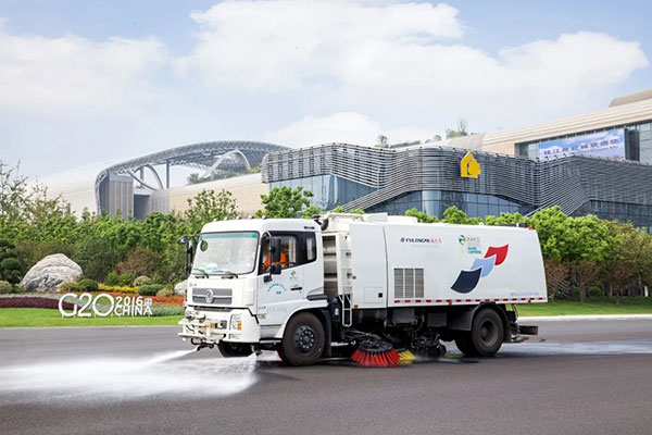 2016年,杭州G20峰会,“福龙马”牌洗扫车在场馆周边进行道路保洁服务工作