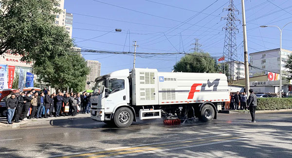 路演环节,“福龙马”牌氢燃料电池洗扫车进行现场作业展示。