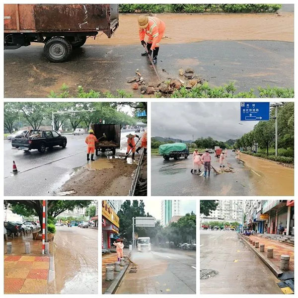 在龙岩市城市管理局、市环卫中心的指导下,龙环人以“雨”为令,闻“汛”而动,迅速启动防汛应急预案,组织防汛防涝,赶排积水、清理路面垃圾、淤泥,全力恢复雨后市容环境交通秩序。