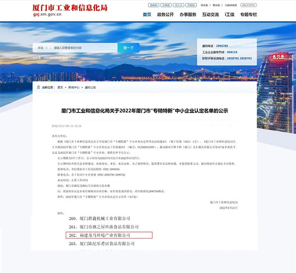福建龙马环境产业有限公司成功入选厦门市“专精特新”企业名单