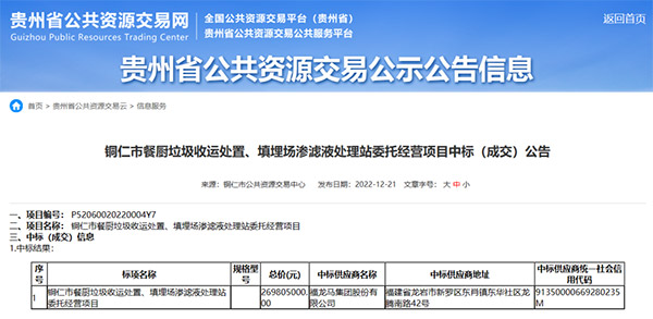 年关将至传捷报,策马扬鞭正当时。近日,福龙马集团旗下业务板块龙马环境科技又迎来了一中标喜讯,继长汀项目之后,公司于2022年12月21日以2.698亿成功中标铜仁市餐厨垃圾收运处置、填埋场渗滤液处理站委托经营项目,项目运营期30年。该项目主要处理铜仁市餐厨垃圾及配套填埋场渗滤液,处理规模为餐厨垃圾100t/d、渗滤液80t/d,主体工艺采用“预处理+厌氧+污水处理”。