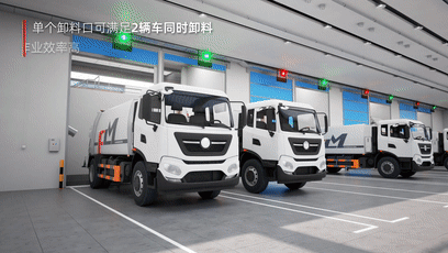 转运站满足大型垃圾收集车卸料需求,单个卸料口可满足2辆车同时卸料,卸料效率高;可配套最大28m³垃圾箱,垃圾压实密度650kg/m³~800kg/m³,箱体单次装载量大,转运效率高。