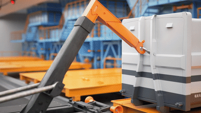 垃圾箱压满后提门装置将闸门关闭,锁紧装置把锁钩打开,推拉装置将垃圾箱推开后,完成机箱分离,操作移箱平台进行换箱操作后继续进行压装作业。