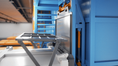勾臂车将空箱放到移箱平台上,移动空箱与压缩机对接,推拉装置把空箱拉近,锁紧装置将其抱紧,随后提门装置将空箱闸门提起。