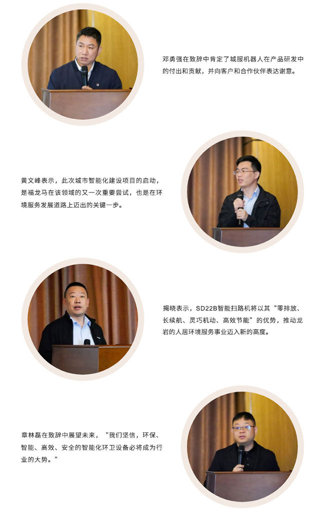 福龙马集团董秘邓勇强,福龙马城服机器人总经理章林磊,环境服务事业部技术研究院院长黄文峰、闽赣战区运营副总监卢钟辉,福建龙环总经理揭晓、副总经理吴强华、张桂涛出席本次交车仪式。邓勇强、黄文峰、揭晓及章林磊等领导先后为仪式致辞。