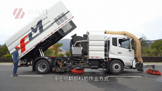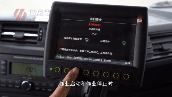车辆采用"显示屏+控制器+CAN总线操作面板"的控制模式。作业启动和作业停止时,副发动机转速控制、吸嘴升降、扫盘收放等作业装置全由一键控制,操作简便。车辆作业由三处操作装置实现,其中两处在驾驶室内,一处在车辆后部右侧的操作面板。