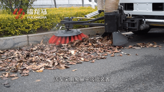 采用大口径高内腔专用吸树叶吸嘴,提高树叶收集及吸拾能力;车头前端设置有可滑移扫盘+象鼻子吸拾装置,对树叶进行第一道吸拾,减少中置吸嘴吸拾量,大大提升整车吸拾性能。