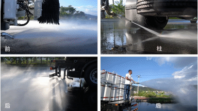 整车标配洒水作业与我司其余产品一致包括前鸭嘴冲洗、柱状对冲、后洒水、后高喷水枪。各项洒水作业流量大、范围广可适应不同路面不同功能的需求。
