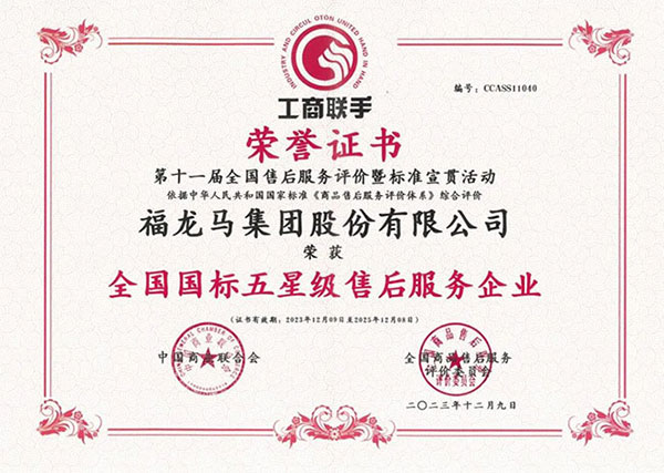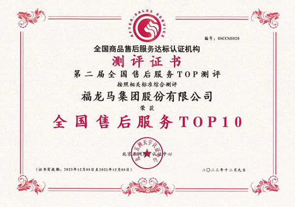 福龙马集团已连续多届期获得《全国国标五星级售后服务企业》、《全国售后服务TOP10》等高等级权威认证。这既是国家权威认证机构对福龙马集团售后服务能力及体系的综合检验与高度认可,也是对福龙马集团的激励与鞭策。