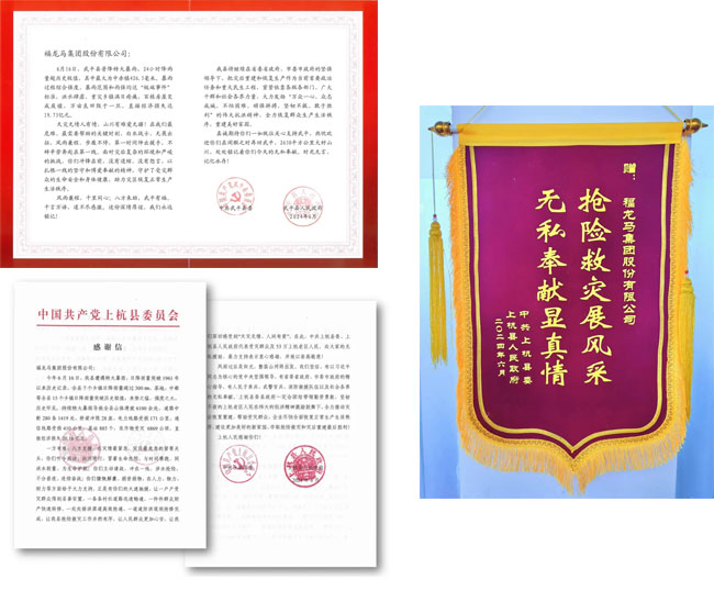 近日,福龙马集团收到中共上杭县委、上杭县人民政府以及中共武平县委和武平县人民政府颁发的感谢信和锦旗,对福龙马在“6•16”特大暴雨中的灾后重建工作中给予的倾力支援表达感谢。