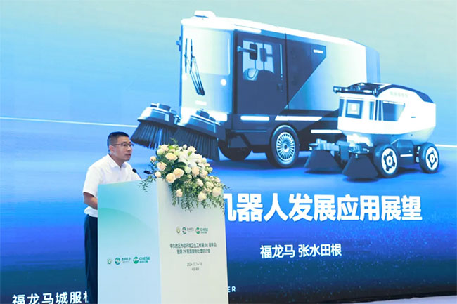 在当天下午举行的“智慧环卫与生活垃圾、资源化利用高峰论坛”上,来自福龙马智能技术研究院的产品经理张水田根作了题为《环卫机器人发展应用展望》 的分享,探讨了环卫机器人在未来城市清洁管理中的应用,强调了技术创新对于提升环卫工作效率和实现可持续发展目标的重要性。