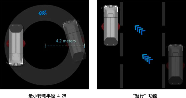 低速状态下,后轮可随前轮实现异向偏转,车辆可斜向循迹