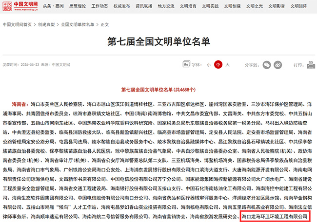 2025年5月23日,全国精神文明建设表彰大会在北京举行,福龙马集团旗下海口龙马环卫环境工程有限公司(以下简称:海口龙马)凭借卓越的社会贡献与精神文明建设成果,荣获"全国文明单位"称号。这一殊荣不仅是福龙马人的骄傲,更是福龙马集团深耕社会责任、践行绿色发展理念的生动注脚。
