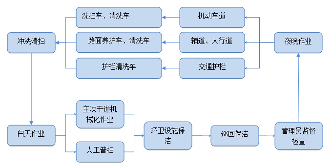 清扫保洁系统 | 所有道路机械化,其余以人工为主,所有道路、街巷全面整治,全日保洁管理 | 主要道路机械化,其余人工保洁为主,硬化道路、主要街巷全面整治,全日保洁管理 | 全部人工保洁,主要道路实施全日保洁,主要街巷定期清理整治 |