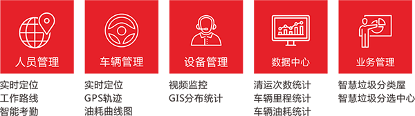 系统覆盖五个模块:智慧化实现监控、指挥调度、垃圾分类收集运输、成本分析等管理职能