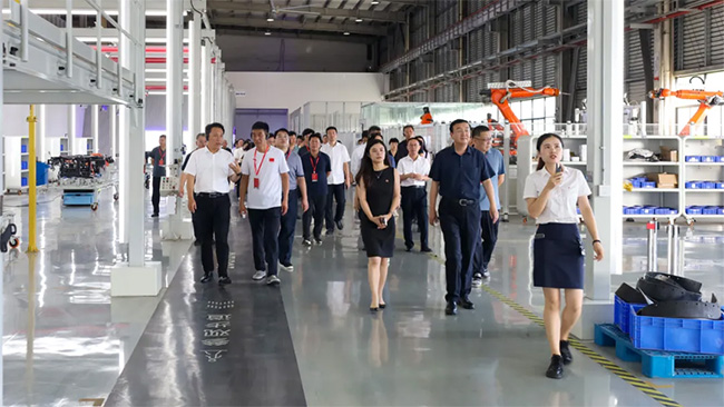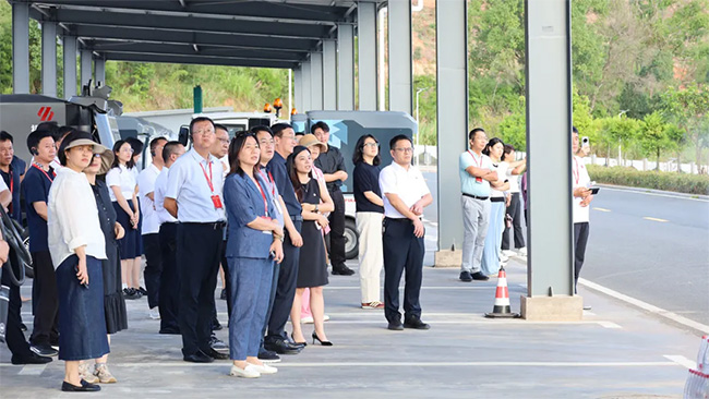 在张西泠等集团领导陪同下,考察团先后绕行厂区、参观城服机器人测试平台,观看移动充电设备、无人驾驶设备及智能洗扫车、路面养护车等产品演示,并深入城服产线了解生产流程。