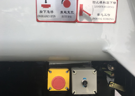 3)在填料器启闭或推板卸料遇到紧急情况需要制动时,在垃圾箱左后下部设有“急停按钮”,将停止压填工作、填料器启闭、推板工作,排除故障后打开“急停按钮”,同时开启相关按钮即可继续进行作业。