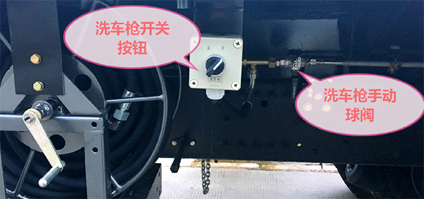 9)使用手持喷枪时,应先先打洗车枪手动球阀开关,再将洗车枪开关按钮转至开位置,洗车枪开始工作。停止工作时,先将洗车枪开关按钮转至关位置,再关闭洗车枪手动球阀开关。当需使洗车枪水压降低,可适当降低副发动机油门。